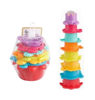 Zestaw kolorowych kubeczków do układania w wieżę. Kubeczki mogą także umilić czas dziecku podczas kąpieli. Produkt zapakowany w worek z siateczki. Zabawka przeznaczona dla dzieci od 6 miesiąca życia. Podane