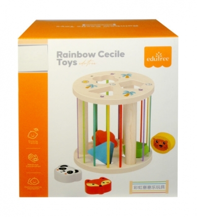Sorter kształtów z kolorowymi elementami do wrzucania. Wykonany z drewna, zapakowany w kartonowe pudełko. Zabawka przeznaczona dla dzieci od 24 miesiąca życia. Wymiary opakowania są wymiarami pudełka.