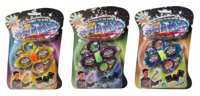 Zabawka zręcznościowa typu spinning to pełna efektów zabawka, która zachwyci każde dziecko. Za pomocą dołączonych pierścieni dziecko wprawia zabawkę w ruch, a obrotowe elementy zaczynają świecić, tworząc kolorowy wir świateł. Zabawka działa na baterie typu AG3. Baterie znajdują się w zabawce. Produkt występuje w kilku wersjach kolorystycznych, wybierany losowo. Cena dotyczy jednej sztuki. Zabawka zapakowana w kartonową podstawkę z przezroczystym kloszem.