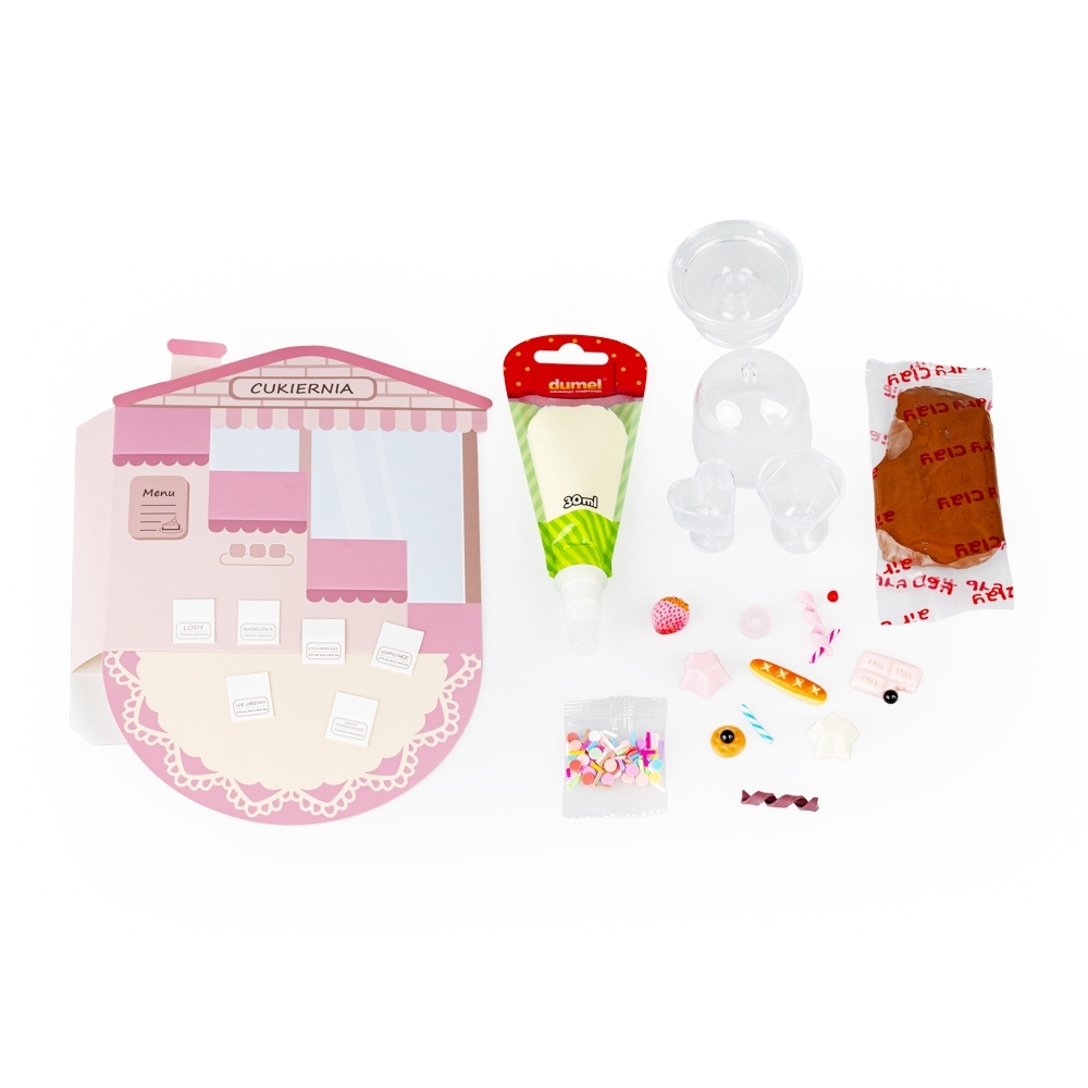 Opakowanie zawiera wszystko, czego potrzeba, aby „wyczarować” wiele zabawkowych smakołyków. Poza masą plastyczną, do formowania ciasta, i masą kremową w tubce, do dekorowania, znajdziesz tu też papierową witrynę do wyeksponowania deserów, plastikowe pucharki, paterę oraz wiele kolorowych dodatków, z pomocą których ozdobisz stworzone przez siebie, zabawkowe desery. Po udekorowaniu każdego z nich, pozostaw desery, aby stwardniały, najlepiej na całą dobę.