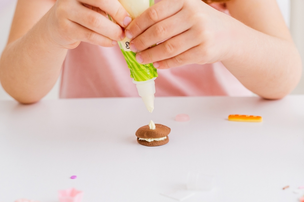 - kreatywny zestaw do stworzenia zabawkowych deserów i udekorowania ich za pomocą masy do wyciskania oraz dołączonych akcesoriów;