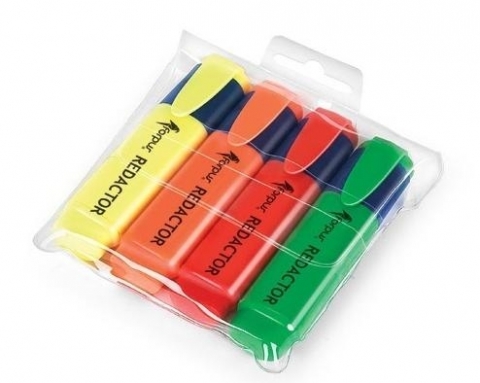 Komplet 4 zakreślaczy. Fluorescencyjny tusz na bazie wody. Intensywne kolory. Precyzyjna ścięta końcówką zakreślającą. Obudowa w kolorze tuszu. Do użytku na wszystkich rodzajach papieru.