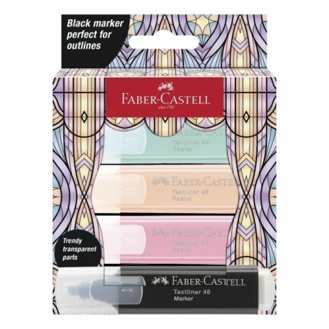 Wysokiej jakości zakreślacze Faber-Castell edycja Pastel o eleganckim i nowoczesnym designie. Idealne do wszystkich rodzajów papieru, z tuszem na bazie wody. Linia zakreślania o szerokości 5, 2 lub 1 mm oraz wytrzymała, ścięta końcówka zapewniają precyzyjne użycie. Zestaw zawiera czarny marker do konturów.