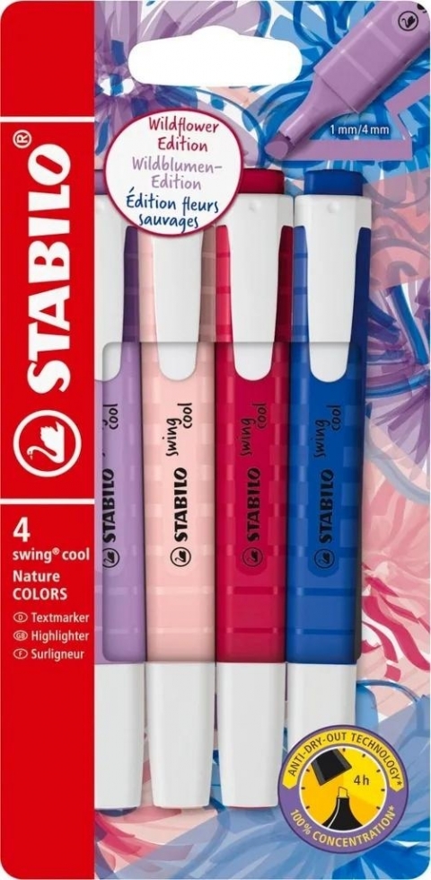 Zaprojektowany z myślą o osobach, które kochają kolory inspirowane naturą, zakreślacz STABILO swing cool NatureCOLORS Wildflower wyróżnia się nowoczesnymi odcieniami o subtelnej intensywności, które podkreślają każdy dokument i materiał do nauki. Cztery kolory ultramaryna, burgund, szaro-fioletowy oraz pudrowy róż idealnie nadają się do tworzenia estetycznych podkreśleń podczas porządkowania notatek i dokumentów.