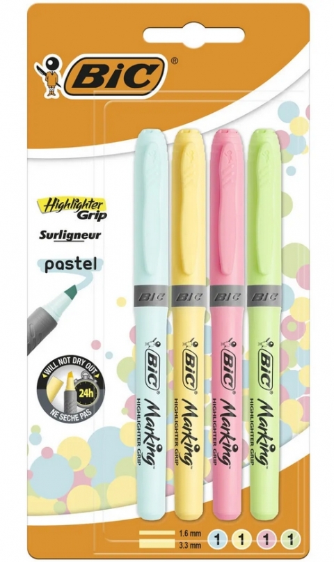 Zakreślacze Highlighter Grip BIC w 4 pastelowych kolorach: niebieskim, żółtym, różowym oraz zielonym.