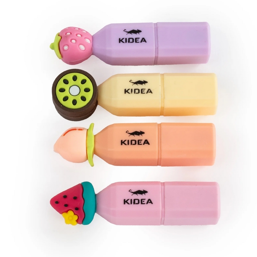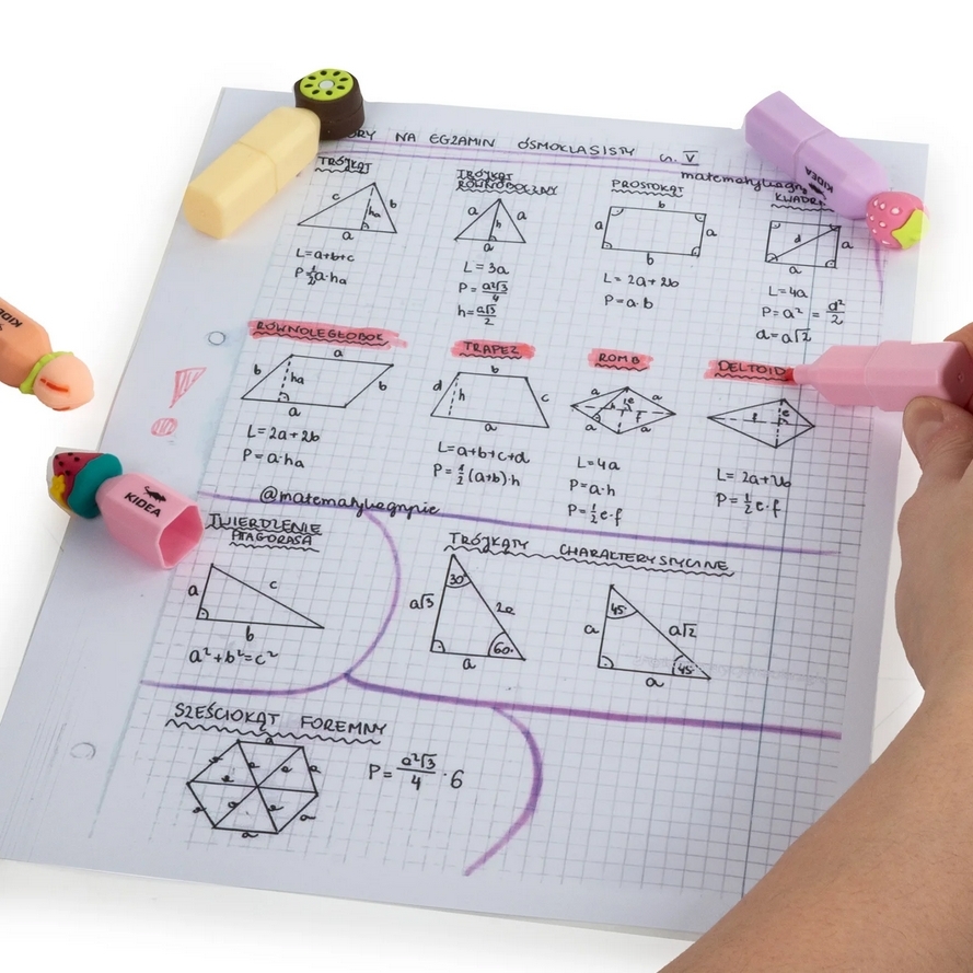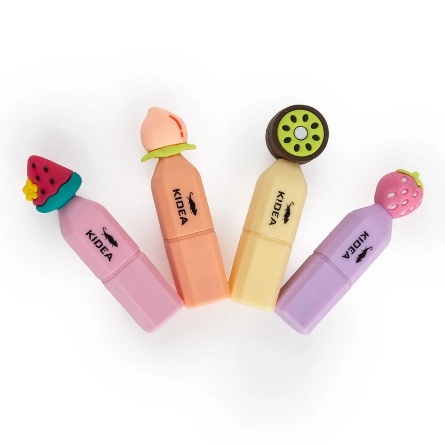 Zestaw 4 zakreślaczy w delikatnych kolorach z owocowymi zatyczkami: fioletowy (truskawka), różowy (arbuz), pomarańczowy (brzoskwinia) i żółty (kiwi). Subtelne kolory idealne do zaznaczania tekstu. Wyposażone w ściętą końcówkę dla precyzyjnego zakreślania. Doskonały zestaw na prezent dla uczniów, studentów i miłośników kreatywnych akcesoriów biurowych i szkolnych, łączący estetykę z praktycznością.
