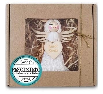 Anioł Stróż - Rękodzieło wyprodukowane w Polsce. Figurka Anioła o wymiarach 10x7cm, ułożona na wełnie drzewnej, całość zapakowana w ekologiczne pudełeczko z okienkiem opasane złotym sznureczkiem.