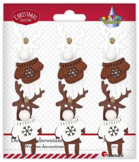 Zawieszki drewniane renifery w sweterkach, nosy z pomponów 40x75mm 2 wzory biało-brązowe, brązowo-białe 6szt.