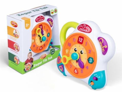 Wesoły, dwujęzyczny (angielski/polski) zegar, który poprzez zabawę pomoże Maluszkowi w nauce cyfr, godzin i rozpoznawaniu kształtów. Kiedy dziecko zacznie przesuwać wskazówki, usłyszy ustawioną przez siebie godzinę. Po przełączeniu na Quiz, Maluszek będzie miał za zadanie wskazać konkretną godzinę. Zegar wyposażony jest także w wesołe melodie i świecące przyciski, które zachęcą dziecko do zabawy. Wygodny do przenoszenia uchwyt pozwoli zabrać ze sobą Zegar w dowolne miejsce.