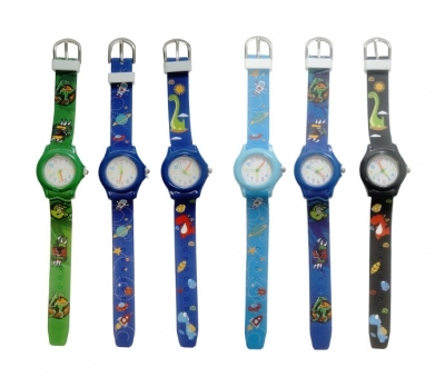 Zegarek dziecięcy na pasku z kolorowymi wzorami. Występuje w różnych kolorach, kolor wybierany losowo. Cena dotyczy jednej sztuki. Zabawka przeznaczona dla dzieci od lat 3. Podane wymiary są wymiarami opakowania.