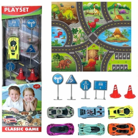 Zestaw Samochodowy "PLAYSET Classic Game" z Matą Drogową i Akcesoriami! Wyrusz w podróż pełną przygód z naszym fantastycznym zestawem samochodowym "PLAYSET Classic Game"! Ten kompleksowy komplet pozwoli Twojemu dziecku stworzyć własne miasteczko lub świat dinozaurów, rozwijając wyobraźnię i ucząc zasad ruchu drogowego. Cechy produktu: Duża Mata Drogowa: W zestawie znajduje się kolorowa, elastyczna mata z nadrukowanymi drogami, mostami, jeziorami i zielonymi terenami. Co więcej, mata posiada również motywy z dinozaurami (wulkany, tereny jurajskie), co pozwala na tworzenie dwóch rodzajów scenariuszy zabawy - miejskiego i prehistorycznego. Sześć Samochodów Sportowych: Komplet zawiera sześć miniaturowych samochodów sportowych w różnych, jaskrawych kolorach (m.in. żółty, niebieski, zielony, pomarańczowy, fioletowy, srebrny). Są to modele wykonane z dbałością o detale, idealne do wyścigów po macie. Akcesoria Drogowe: W zestawie znajdziesz również elementy, które wzbogacą zabawę i nauczą dziecko zasad ruchu drogowego. Edukacja i Rozwój: Zestaw doskonale rozwija wyobraźnię przestrzenną, zdolności manualne oraz kreatywność. Dzieci mogą odgrywać role kierowców, uczyć się rozpoznawać znaki drogowe i tworzyć własne, fascynujące historie. Wygodne Opakowanie: Cały zestaw zapakowany jest w estetyczne pudełko z uchwytem, co ułatwia przechowywanie i przenoszenie. Okienko w opakowaniu prezentuje część zawartości. Wiek: Produkt przeznaczony dla dzieci w wieku 3 lat i starszych Wielkość opakowania: 36x11x8 cm Idealny dla: Dzieci uwielbiających samochody i zabawy w odgrywanie ról. Rozwijania wyobraźni i kreatywności. Nauki podstawowych zasad ruchu drogowego. Prezentu na urodziny, Dzień Dziecka czy inną okazję. Z naszym zestawem "PLAYSET Classic Game" Twoje dziecko może zbudować swój własny świat i wyruszyć na niezapomniane, edukacyjne przygody!