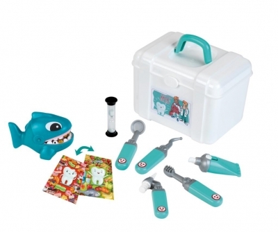 Zabawka Klein 4326 Zestaw dentystyczny dla dzieci, który pozwala im bawić się w lekarza i pacjenta. Zabawka zawiera między innymi sztuczne zęby, lusterko, szczoteczkę, pastę, wiertło i strzykawkę. W zestawie znajduje się również zabawkowy rekin, który ma zarówno zdrowe zęby, jak i chore zęby, które wymagają pilnej interwencji medycznej. Wszystkie zabawkowe akcesoria dentystyczne i rekin są zapakowane w białą walizeczkę z uchwytem i zamknięciem. Zabawa tą walizką i małym rekinem może pomóc wielu dzieciom w przezwyciężeniu strachu przed wizytą u dentysty. To świetny sposób na rozwijanie kreatywności i wyobraźni dziecka. Dziecko może także tworzyć własne scenariusze zabawy, np. leczyć chore zęby swoich pluszaków, zapobiegać próchnicy u lalek, czy sprawdzać stan uzębienia swoich przyjaciół. To zabawka, która uczy dziecko o higienie jamy ustnej i dbaniu o zdrowie zębów, a także daje dziecku wiele radości i satysfakcji. Zabawka, która sprawi, że wizyta u dentysty nie będzie już straszna.