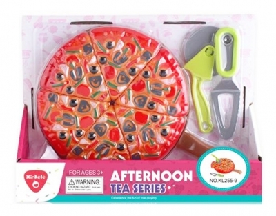 Zabawka przedstawiająca pizzę podzieloną na kawałki, którą można kroić i ponownie łączyć. Elementy pizzy posiadają różne kolorowe dodatki, dzięki czemu zestaw wygląda realistycznie. W komplecie znajdują się również akcesoria kuchenne do zabawy w przygotowywanie i serwowanie potraw. Produkt przeznaczony dla dzieci od 3 lat. Zabawka zapakowana w kartonowe opakowanie. Podane wymiary są wymiarami opakowania.