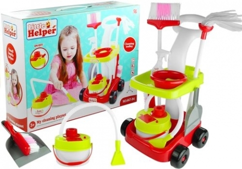 Zestaw do sprzątania w wózeczkuZabawki inspirowane prawdziwymi przedmiotami mogą połączyć przyjemną zabawę z pożytecznym zadaniem, na przykład oswajając dziecko z domowymi obowiązkami. Jeśli jednak Twój maluch już teraz chętnie pomaga sprzątać w domu, obdaruj go własnym sprzętem składającym się z najważniejszych elementów, które umieszczone są na rewelacyjnym wózeczku. Wszelkie akcesoria składające się na zabawkowy zestaw do sprzątania są wierną kopią ich pełnowymiarowych wzorców, przedstawioną w przyjazny, dziecięcy sposób. Kształty zabawek, a także ich kolorystyka, zachęcają do podjęcia zabawy, dzięki czemu dziecko może poczuć się samodzielniej i doroślej, sprzątając razem z innymi domownikami.W zestawie do sprzątania znajduje się:- wózek,- odkurzacz wodny,- mop,- miska,- szczotka na długim kiju,- zmiotka,- szufelka,- mydło,- spryskiwacz do powierzchni.Główny element zestawu do sprzątania to wózeczek, który umieszczony jest na ułatwiających zabawę kołach. Służy on do łatwego przemieszczania się z zabawkami do sprzątania po domu, a także jako miejsce, w którym można je przechowywać. Kolejnym istotnym elementem zabawki jest odkurzacz wodny, wydający dźwięki przypominające prawdziwe odkurzanie. Wystarczy zasilić go trzema sztukami baterii AA 1,5V i wcisnąć guzik uruchamiający zabawkę. Akcesoria ułatwiające wykonywanie obowiązków domowych pozwolą na włączenie się dziecka do weekendowych porządków, a także naśladowanie rodziców i starszego rodzeństwa.Zabawkowy wózeczek wypełniony przeróżnymi przyrządami do sprzątania to doskonały pomysł na prezent. Wesoło spędzając czas na zabawie, dziecko będzie się uczyć, jak prawidłowo zamiatać i myć podłogę. Kolorystyka zestawu jest neutralna, składa się z czerwonego, zielonego i białego koloru. Uważamy, że dzięki temu sprawdzi się zarówno dla dziewczynki, jak i chłopca. Wymiary zabawek dostosowane są do rączek małych dzieci, dzięki czemu zabawa będzie bardzo komfortowa i prosta. Materiał, jakiego użyto do produkcji zabawki, jest bardzo solidny i trwały, a przede wszystkim bezpieczny. Zestaw do sprzątania posiada certyfikat CE, będący deklaracją, że zabawka spełnia wszelkie wymogi normy Unii Europejskiej. Wózeczek z akcesoriami zapakowany jest w kolorowe pudełko typu walizka, na którego górze umieszczona jest rączka ułatwiająca przenoszenie.Wymiary elementów zabawki:- wózek: 32 cm x 51,5 cm x 32 cm,- szczotka: 50 cm x 13,5 cm,- miska: 13,5 cm x 4,5 cm,- odkurzacz wodny: 13 cm x 14 cm.Wymiary opakowania zabawki:- 48 cm x 38 cm x 14,5 cm.