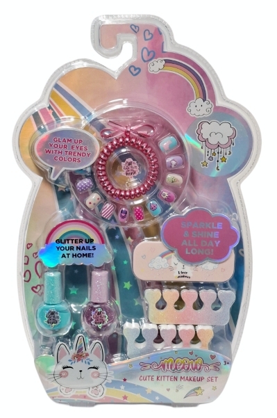 Zestaw do makijażu z motywem kotka. W komplecie lakiery do paznokci, pilniczek, separatory do paznokci, tipsy i bransoletka. Produkt przeznaczony dla dzieci od lat 3. Produkt zapakowany w przezroczyste opakowanie. Podane wymiary są wymiarami opakowania.