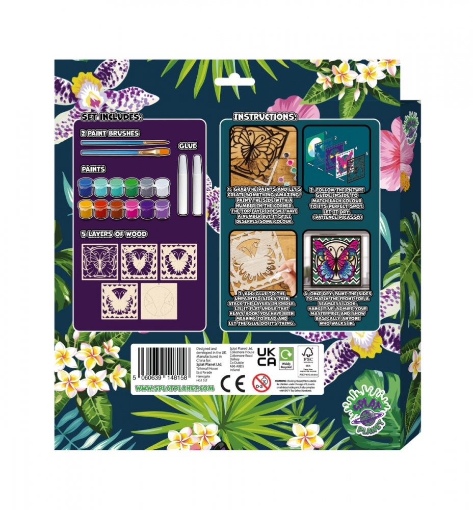 Standardowy rozmiar to 25 cm x 25 cm. Zestaw zawiera 2 pędzle, farby, 5 drewnianych warstw oraz klej.
