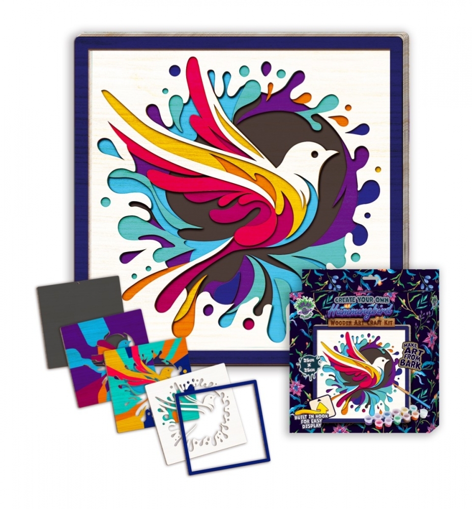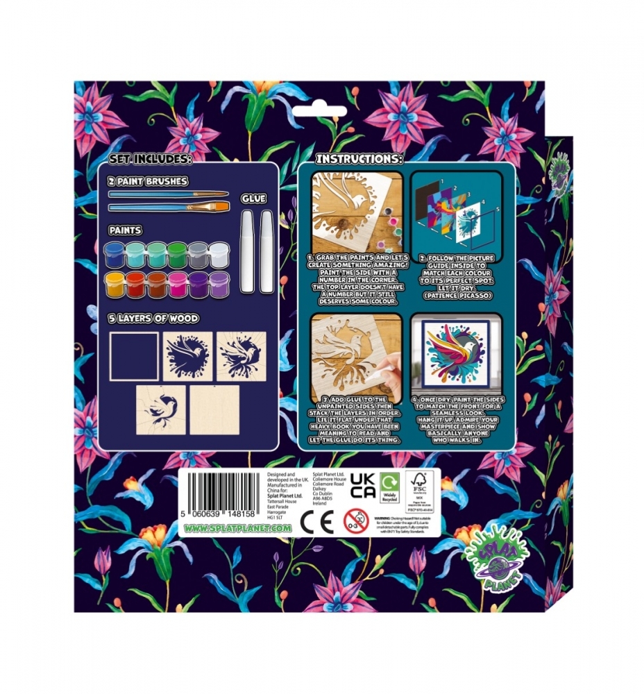 Standardowy rozmiar to 25 cm x 25 cm. Zestaw zawiera 2 pędzle, farby, 5 drewnianych warstw oraz klej.