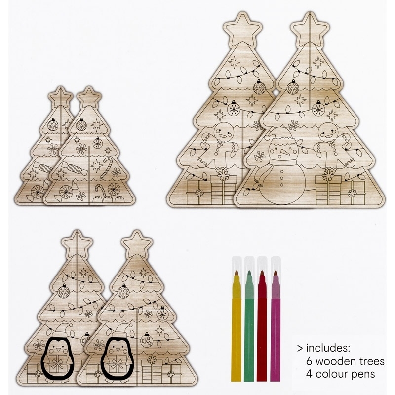 Stojące choinki które można postawić w dowolnym miejscu w całym domu, idealnie pasują do wystroju świątecznego. Zestaw zawiera: 6 drewnianych choinek, 4 kolorowe mazaki, pędzelek.