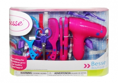 Zestaw fryzjerski dla małych fryzjerek. Pomoże wyćwiczyć zręczność i rozbudzi kreatywność u dzieci. W skład zestawu wchodzi m.in. suszarka do włosów, grzebień, prostownica, lusterko i saszetka fryzjerska.