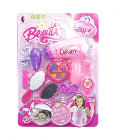 Zestaw fryzjerski dla małej pięknisi wraz z biżuterią. W skłąd zestawu wchodzi: suszarka, grzebień, lusterko, spinki do włosów i zegarek.