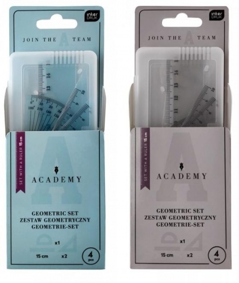 - w zestawie 4 elementy: linijka 15 cm, ekierka ostrokątna, ekierka prostokątna i kątomierz