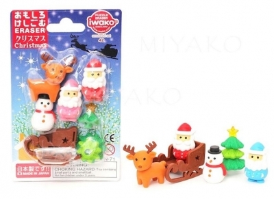 Gumki do mazania w kształcie choinki, mikołaja, renifera, bałwanka i sań,