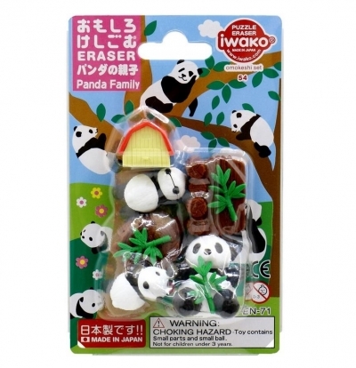 Gumki do mazania w kształcie pand, domku, oraz drzew.
