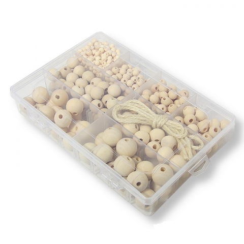 Zestaw koralików drewnianych zapakowanych w plastikowe pudełeczko: