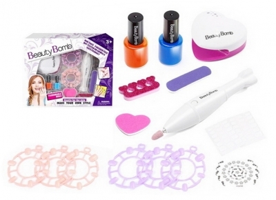 Zestaw kosmetyczny z akcesoriami do stylizacji paznokci. W zestawie m.in.: lakiery, pilnik, ozdoby oraz elektryczna lampa i frezarka do paznokci. Wybrane elementy zestawu działają na baterie AA. Baterie nie są załączone do zabawki. Zabawka przeznaczona dla dzieci od lat 3. Zestaw zapakowany w kartonowe pudełko. Podane wymiary są wymiarami opakowania.
