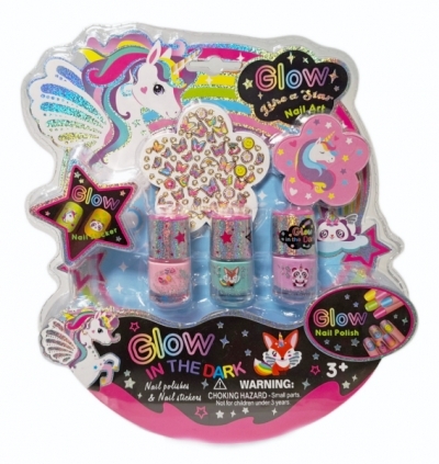 Zestaw 3 kolorowych lakierów do paznokci W komplecie lakiery, pilniczek oraz ozdobne naklejki do paznokci, tworzące spójną tematyczną całość. Lakiery świecą w ciemności. Produkt przeznaczony dla dzieci od lat 3. Produkt zapakowany w przezroczyste opakowanie. Podane wymiary są wymiarami produktu w opakowaniu.