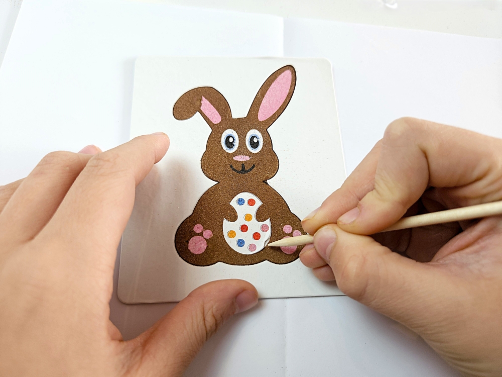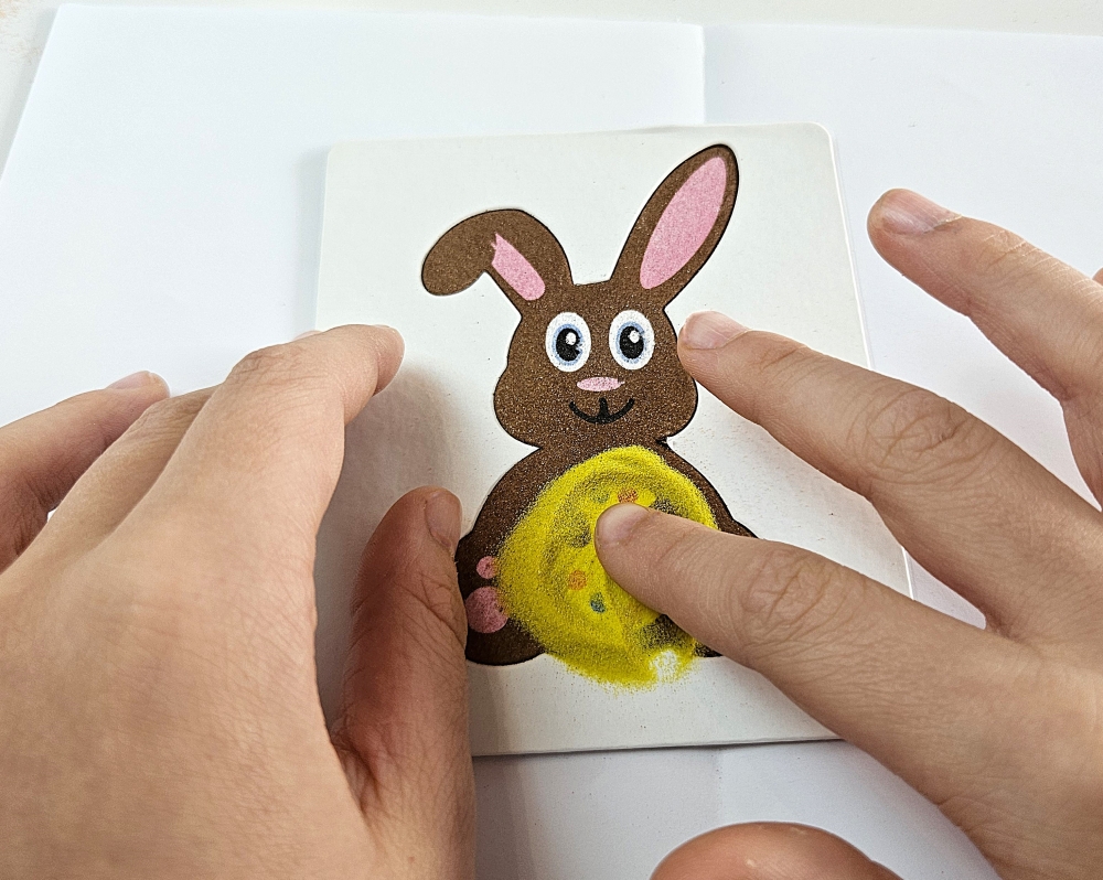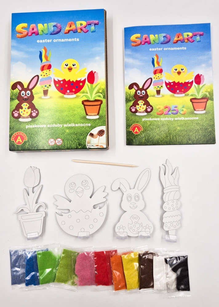 Wystarczy odkleić fragment ilustracji i posypać go wybranym kolorem piasku, by krok po kroku powstało małe dzieło sztuki. To prosta i satysfakcjonująca zabawa kreatywna na Wielkanoc, która daje dziecku poczucie dumy z własnoręcznie wykonanej pracy.