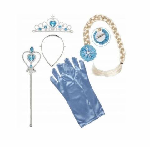 Spełnij marzenia swojej małej księżniczki dzięki temu uroczemu zestawowi w niebieskich odcieniach! W komplecie znajdują się błyszczące rękawiczki, elegancka tiara, długi blond warkocz oraz czarodziejska różdżka - wszystko, co potrzebne, aby stworzyć prawdziwie królewski wygląd.