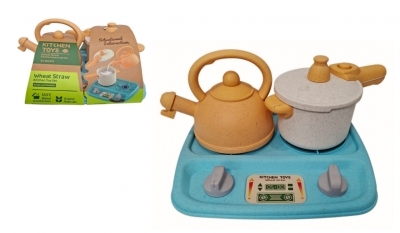 Zestaw kuchenny z czajniczkiem, garnkiem i kuchenką. Wykonany z materiału typu wheat straw. Zapakowany w kartonową przekładkę. Podane wymiary są wymiarami zestawu w opakowaniu. Zabawka przeznaczona dla dzieci od lat 3.