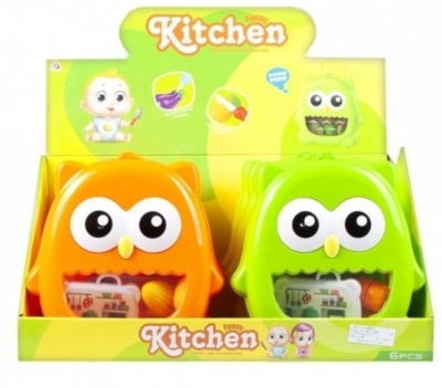 Wieloelemntowy zestaw kuchenny dla najmłodszych w uroczej walizce w kształcie sowy.