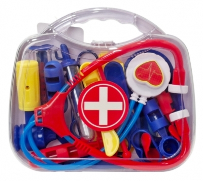 Zestaw lekarski do zabawy wykonany z tworzywa sztucznego. W zestawie akcesoria medyczne m.in.: stetoskop, strzykawka, młotek, nożyce zapakowane w poręcznej walizce. Zabawka przeznaczona dla dzieci od lat 3. Podane wymiary są wymiarami walizki.