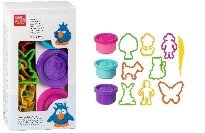 Zestaw 3 mas do modelowania (każda po 20 g) i 8 plastikowych foremek do wycinania.