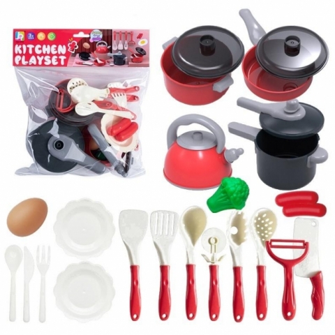 Zestaw Kuchenny "Kitchen Playset" - Mały Kucharz w Akcji! Opis produktu: Przedstawiamy fantastyczny zestaw kuchenny "Kitchen Playset", który rozbudzi kulinarną pasję w każdym dziecku! Ten bogaty komplet realistycznych akcesoriów kuchennych pozwoli maluchom naśladować dorosłych, rozwijać kreatywność i cieszyć się godzinami wspaniałej zabawy w gotowanie. Co zawiera zestaw? Garnki i patelnie: Dwa garnki z pokrywkami (jeden czerwony, jeden czarny) oraz czajnik, idealne do "gotowania" i "smażenia". Naczynia: Dwa talerzyki, widelec i łyżka, aby móc "zaserwować" swoje kulinarne arcydzieła. Narzędzia kuchenne: Szeroki wybór przyborów, takich jak: o Łopatki o Chochelka o Łyżka cedzakowa o Nóż o Obieraczka o I inne! (łącznie ok. 7-8 różnych narzędzi) Produkty spożywcze: Jajko i kawałek brokułu, które dodają realizmu i zachęcają do "przygotowywania posiłków". Całość zapakowana w praktyczne opakowanie: Zestaw przyborów i mniejszych elementów umieszczony w foliowym woreczku z nagłówkiem. Cechy, które zachwycą: Realistyczne odwzorowanie: Akcesoria są zaprojektowane tak, aby jak najbardziej przypominały prawdziwe sprzęty kuchenne, co zwiększa autentyczność zabawy. Rozwój kreatywności i wyobraźni: Zestaw inspiruje do tworzenia własnych potraw, odgrywania ról kucharza, restauratora czy gospodarza, co rozwija wyobraźnię i umiejętności narracyjne. Wartość edukacyjna: Pomaga dzieciom zapoznać się z podstawowymi narzędziami kuchennymi i procesem przygotowywania posiłków, ucząc przez zabawę. Rozwój umiejętności manualnych: Manipulowanie małymi elementami i narzędziami rozwija precyzję ruchów i koordynację ręka-oko. Bezpieczne materiały: Wykonany z trwałego i bezpiecznego dla dzieci tworzywa sztucznego. Idealny na prezent: Kompletny zestaw, idealny jako prezent na urodziny, święta czy inne okazje. Idealny dla: Małych kucharzy i miłośników zabawy w gotowanie. Dzieci, które uwielbiają naśladować dorosłych. Rodziców szukających zabawki rozwijającej kreatywność i umiejętności manualne. Wielkość opakowania: 18x20x10 cm Wiek: 3 lata +