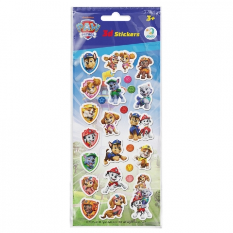 - Jeden arkusz z naklejkami 3D różnego rozmiaru z bohaterami „Psiego Patrolu”.
