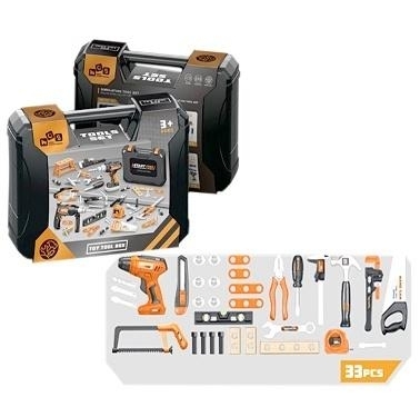 W zestawie: walizka na narzędzia wym. 36,5 x 27,5 x 9,5 cm, wiertarko-wkrętarka, 2 piły ręczne, nożyk techniczny, miarka, suwmiarka, klucz, kombinerki, deseczki, nakrętki, śruby, śrubokręt, poziomica, funkcje: wiertarko-wkrętarka - po naciśnięciu przycisku, wiertło się obraca, wym. opak. 36,5 x 27,5 x 9,5 cm, baterie: 2 x AA 1,5V niedołączone, 3+