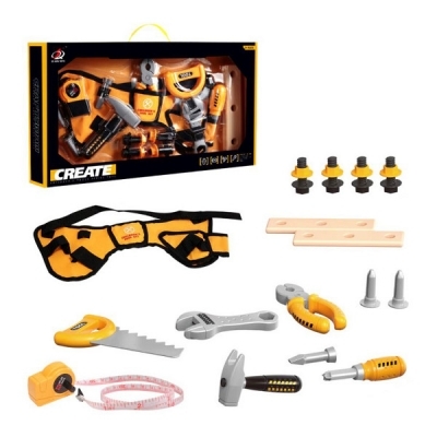· Narzędzia: realistycznie wyglądający młotek, klucz francuski, kombinerki, piła ręczna, śrubokręt z wymienną końcówką oraz miarka.