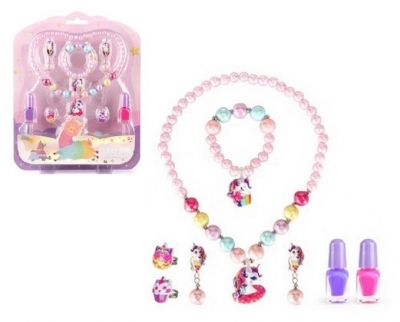 Zestaw biżuterii z motywem jednorożca. W komplecie naszyjnik, bransoletka, kolczyki, pierścionki oraz lakiery do paznokci. Biżuteria w pastelowych kolorach. Zabawka przeznaczona dla dzieci od lat 3. Produkt zapakowany w kartonową podstawkę z przezroczystym kloszem. Podane wymiary są wymiarami opakowania.