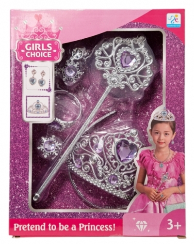 Zestaw biżuterii tiara z różdżką. W zestawie znajdują się także kolczyki, bransoletka i pierścionek. Produkt zapakowany w kartonowe opakowanie. Zabawka dla dzieci od 3 lat. Podane wymiary są wymiarami opakowania.