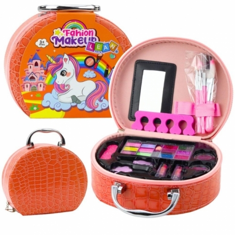 Zestaw kosmetyków dla dzieci to idealna propozycja dla małych miłośniczek makijażu i stylizacji. Całość została umieszczona w eleganckiej kosmetyczce w kolorze pomarańczowym, obszytej materiałem o strukturze skóry, co sprawia, że prezentuje się niezwykle stylowo i nowocześnie.