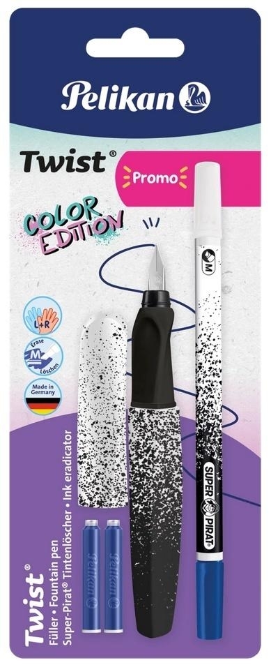 Pelikan Twist to nie tylko stylowe pióro wieczne to także idealny towarzysz codziennego pisania. Teraz dostępne w zestawie z dwoma nabojami atramentowymi i wymazywaczem, który pozwala poprawić każdą pomyłkę bez stresu. Skręcona forma pióra zapewnia maksymalną wygodę i naturalny chwyt, a wyjątkowe wykończenie z efektem malowania sprayem nadaje mu nowoczesny, artystyczny charakter. Wykonane w co najmniej 78% z materiałów pochodzących z odpadów konsumenckich, pióro Twist to świetny wybór nie tylko dla uczniów, ale i wszystkich, którzy cenią ekologiczne, funkcjonalne i inspirujące rozwiązania.
