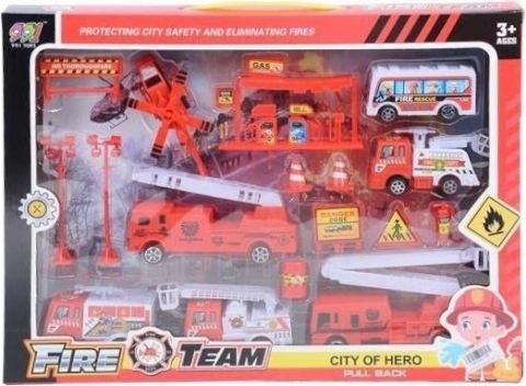 Przygotuj się na bohaterskie akcje z zestawem "Fire Team: City of Hero"! Ten obszerny zestaw zabawek pozwoli Twojemu dziecku wcielić się w rolę strażaka, gaszącego pożary i dbającego o bezpieczeństwo miasta. W komplecie znajdziesz różnorodne pojazdy ratownicze, w tym wozy strażackie z wysuwanymi drabinami, autobus ratunkowy oraz dynamiczny helikopter. Dodatkowo zestaw zawiera stację benzynową do tankowania pojazdów, znaki drogowe ("DANGER ZONE", "DO NOT THROUGHFARE"), pachołki, beczki i słupy oświetleniowe, co pozwala na budowanie realistycznych scenariuszy. Wszystkie pojazdy wyposażone są w system "Pull Back", co zapewnia dodatkową frajdę z zabawy. To idealny prezent dla małych odkrywców od 3. roku życia, rozwijający wyobraźnię i kreatywność poprzez fascynujące, ratownicze misje.