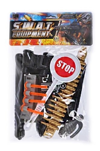 Zalety produktu: uczy odróżniania dobra od zła, uczy zasad gry fair-play, rozwija wyobraźnię poprzez wymyślanie różnych scenariuszy podczas zabawy. Policjant to najczęściej wymieniany zawód, który w przyszłości chciałyby sprawować dzieci. Pozwól by Twoja pociecha już teraz mogła przygotować się do pracy w wymarzonym zawodzie. W zestawie znajdują się: duży pistolet, pałka policyjna, lizak, krótkofalówka, lornetka, pas z nabojami, , 2 x granat, pociski-strzałki samoprzylepne. Produkty wykonane z plastiku. Wymiary/waga/baterie: wymiary produktu (dł. x wys. x gł.)[cm]: pistolet- 25,5x12x4 wymiar opakowania (dł. x wys. x gł.) [cm]: 24x37,5x6, nie wymaga zasilania bateriami. Zestaw przeznaczony dla dzieci w wieku: 3+. Pakowana w woreczek z euro zawieszką.