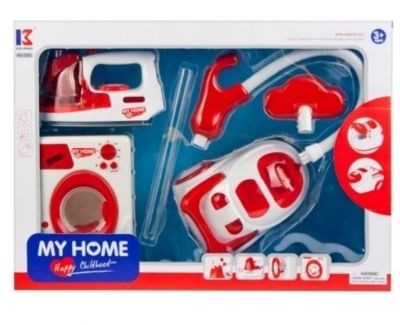Zestaw urządzeń gospodarczych (pralka, odkurzacz, żelazko) doskonale imitujący prawdziwe. Zabawka z efektami dźwiękowymi i świetlnymi.