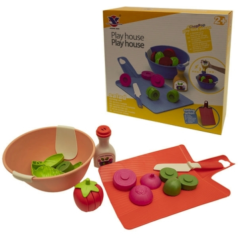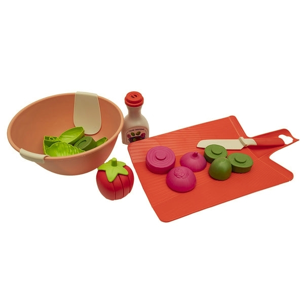 W zestawie znajduje się aż 20 elementów, w tym miska do sałatki, deska do krojenia, nożyk, szczypce, buteleczka na sos oraz warzywa do krojenia - pomidor, ogórek, cebula i sałata.
