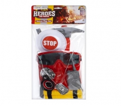 Wieloelementowy zestaw strażacki z maską, nada się idalnie na bal przebierańców lub do zabawy.