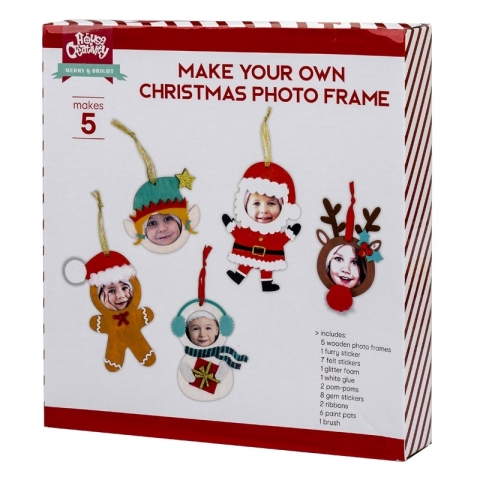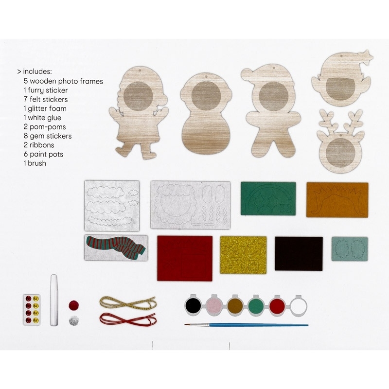 Zawieszki drewniane z miejscem na zdjęcie, są odpowiednie do przywieszenia na choinkę. Zestaw zawiera: 5 drewnianych ramek na zdjęcia, futrzaną naklejkę, 7 filcowych naklejek, brokatową piankę, biały klej, 2 wstążki, 2 pompony, 8 naklejek 3 d, 6 pojemników z farbą, 1 pędzel.